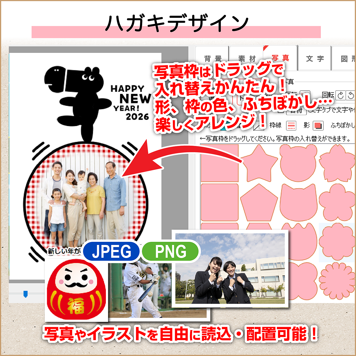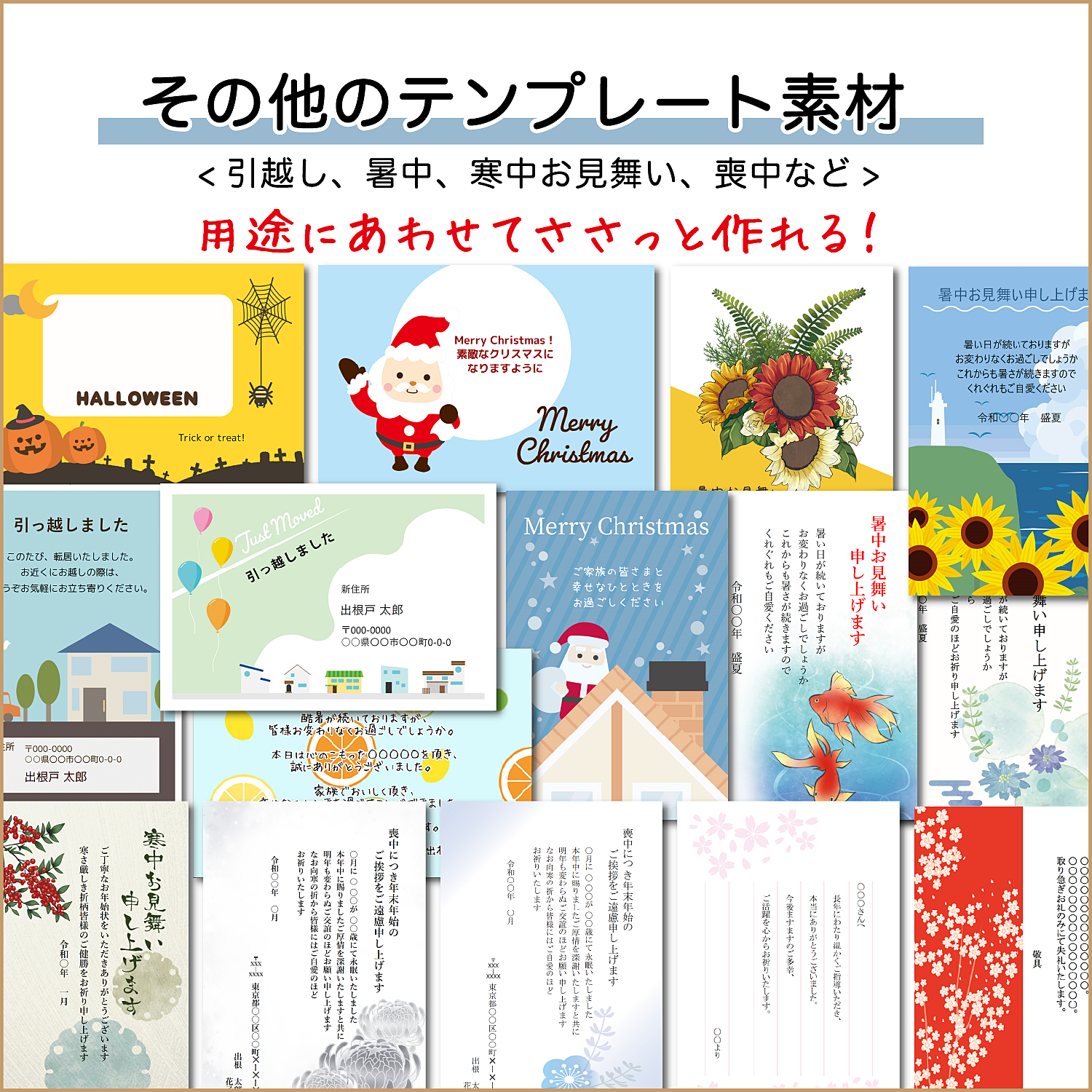 年賀状、暑中見舞い、冠婚葬祭、年中行事など様々なバリエーションのハガキを作成できるので日々の暮らしの中でご利用いただけます。