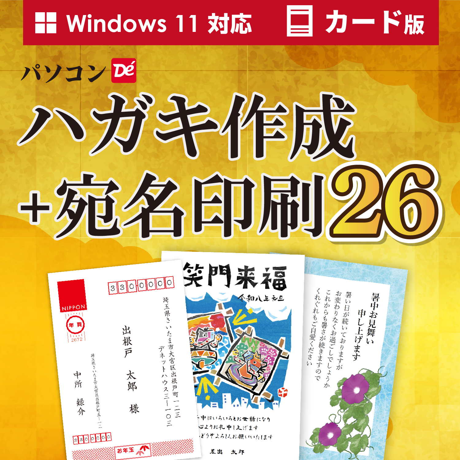 互換性 | 「パソコンでハガキ作成+宛名印刷25」 「パソコンでハガキ作成+宛名印刷24」 「パソコンでハガキ作成+宛名印刷23」 「パソコンでハガキ作成+宛名印刷」 ※「パソコンでハガキ作成+宛名印刷23~25」または「パソコンでハガキ作成+宛名印刷」がインストールされたまま、(旧製品の住所録データが指定場所に残っている状態のまま)「パソコンでハガキ作成+宛名印刷26」をインストールした場合、旧製品の住所録データが共有されます。 |