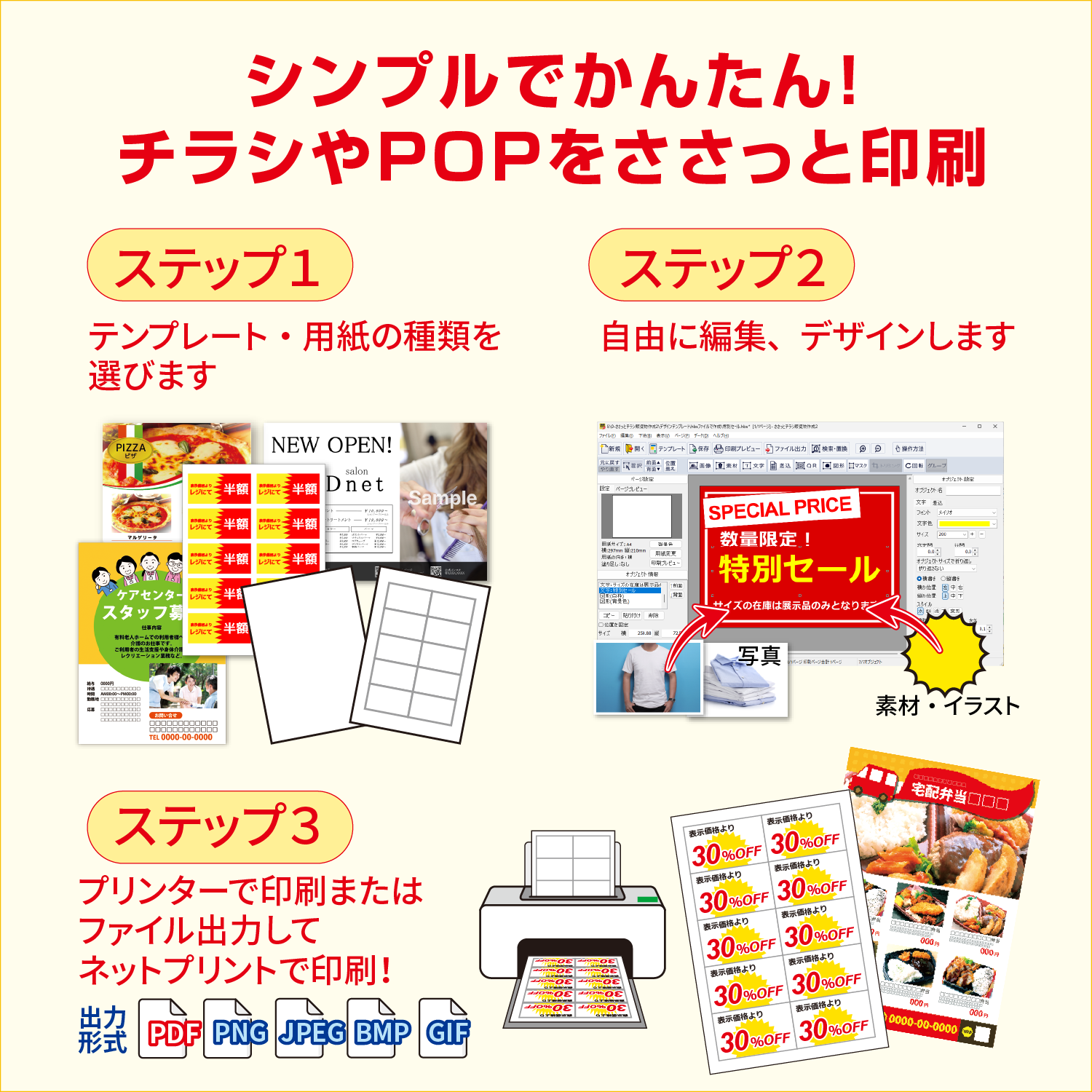 宣伝チラシや魅力的なPOP、メニュー表、商品ラベル、値札カード、窓や壁に貼る掲示物など様々な販促物が作成できるので、飲食店・小売店・クリニック・美容室・学習塾など幅広い業種でお使いいただけます。